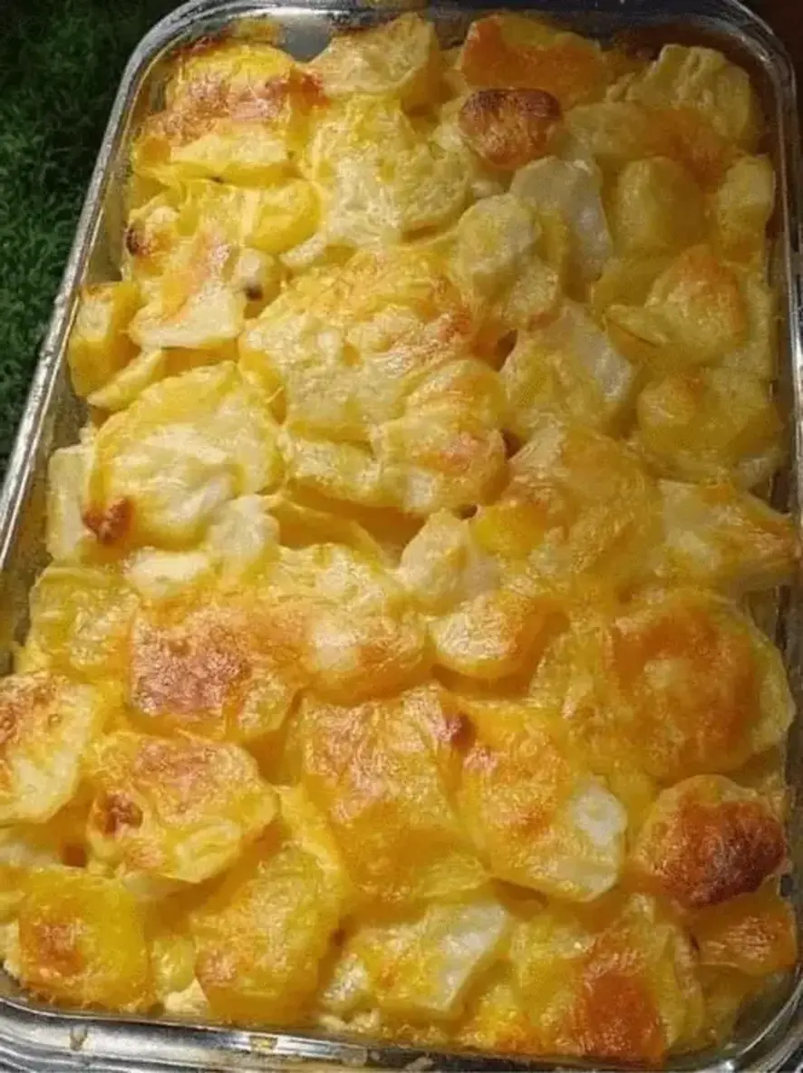 - Arrange half of the potatoes in the casserole dish. Pour half of the cheese sauce over. Repeat with the remaining potatoes and sauce. Sprinkle the extra cheese on top.Bake uncovered for 1 hour, or until potatoes are tender and top is golden brown.