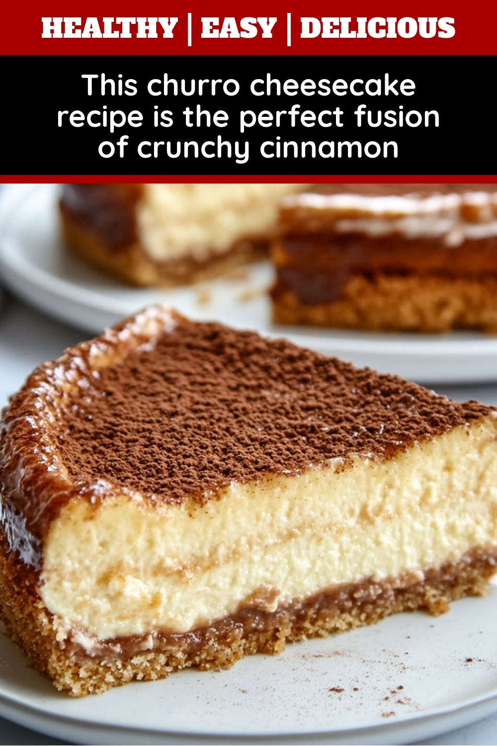 A delicious fusion of crunchy cinnamon churros and creamy cheesecake, perfect for dessert lovers.