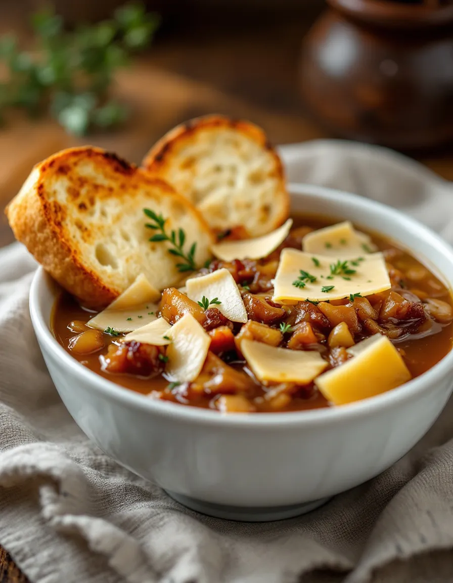 • Visual Appeal: A beautifully golden layer of melted cheese floating on top of the soup, garnished with herbs, provides an inviting and rustic presentation.