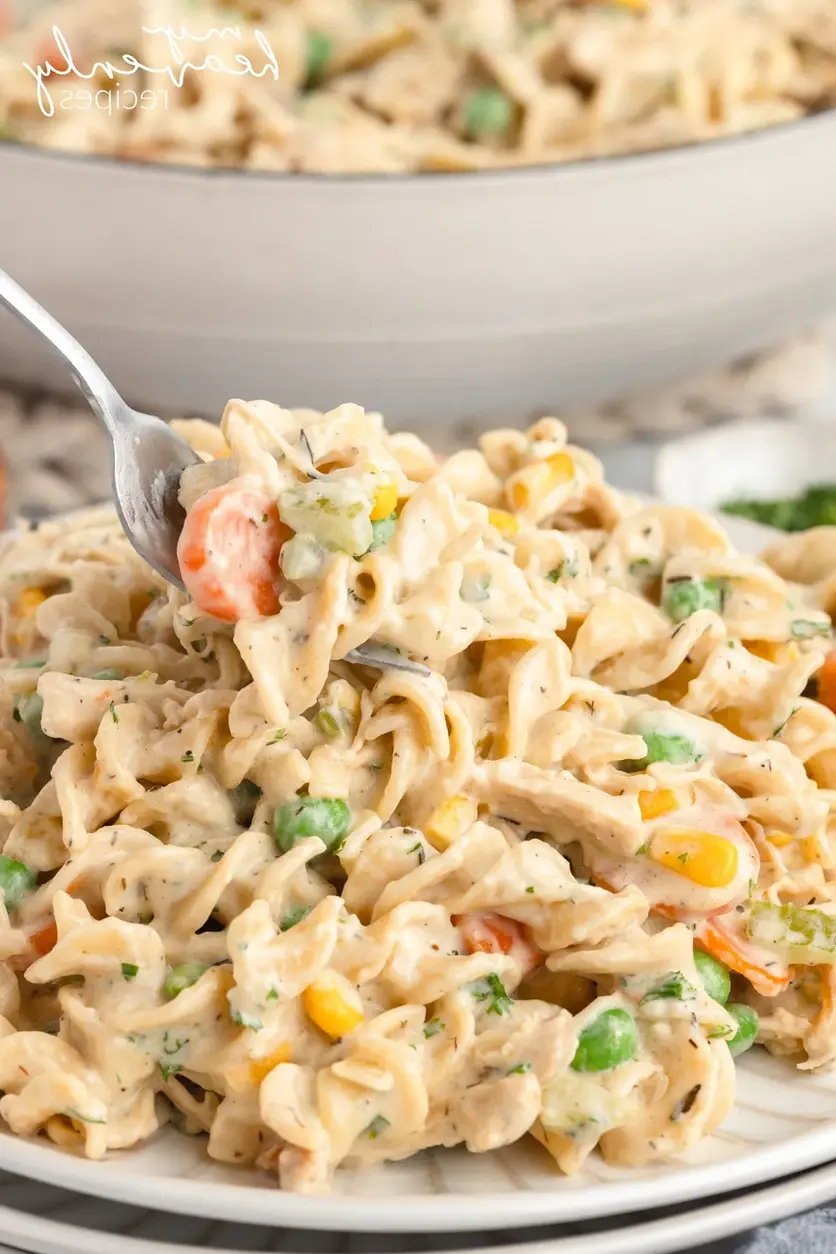 Creamy Chicken Pot Pie Pasta Recipe- easy dinner meal for the family. Crowd pleaser! Comfort meal idea that kids love. Alternative to a traditional chicken pot pie. Easy simple Chicken pot pie noodles dish. Unique dinner idea.