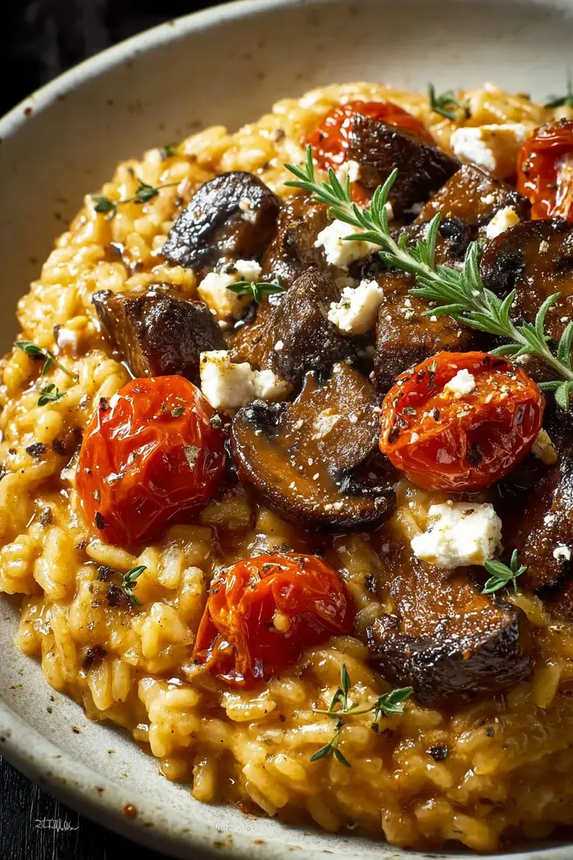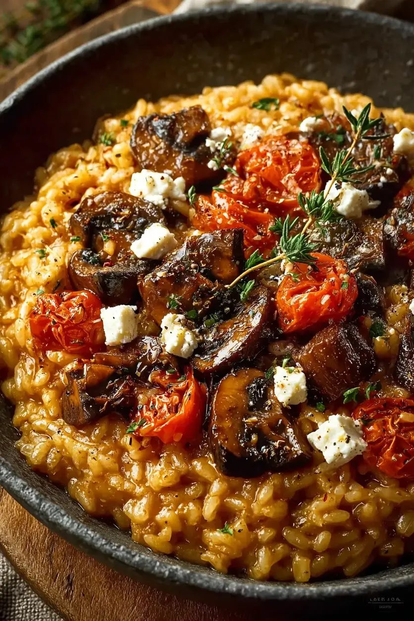 A creamy risotto featuring fresh lemon, tomatoes, mushrooms, and feta cheese for a flavorful, comforting meal.