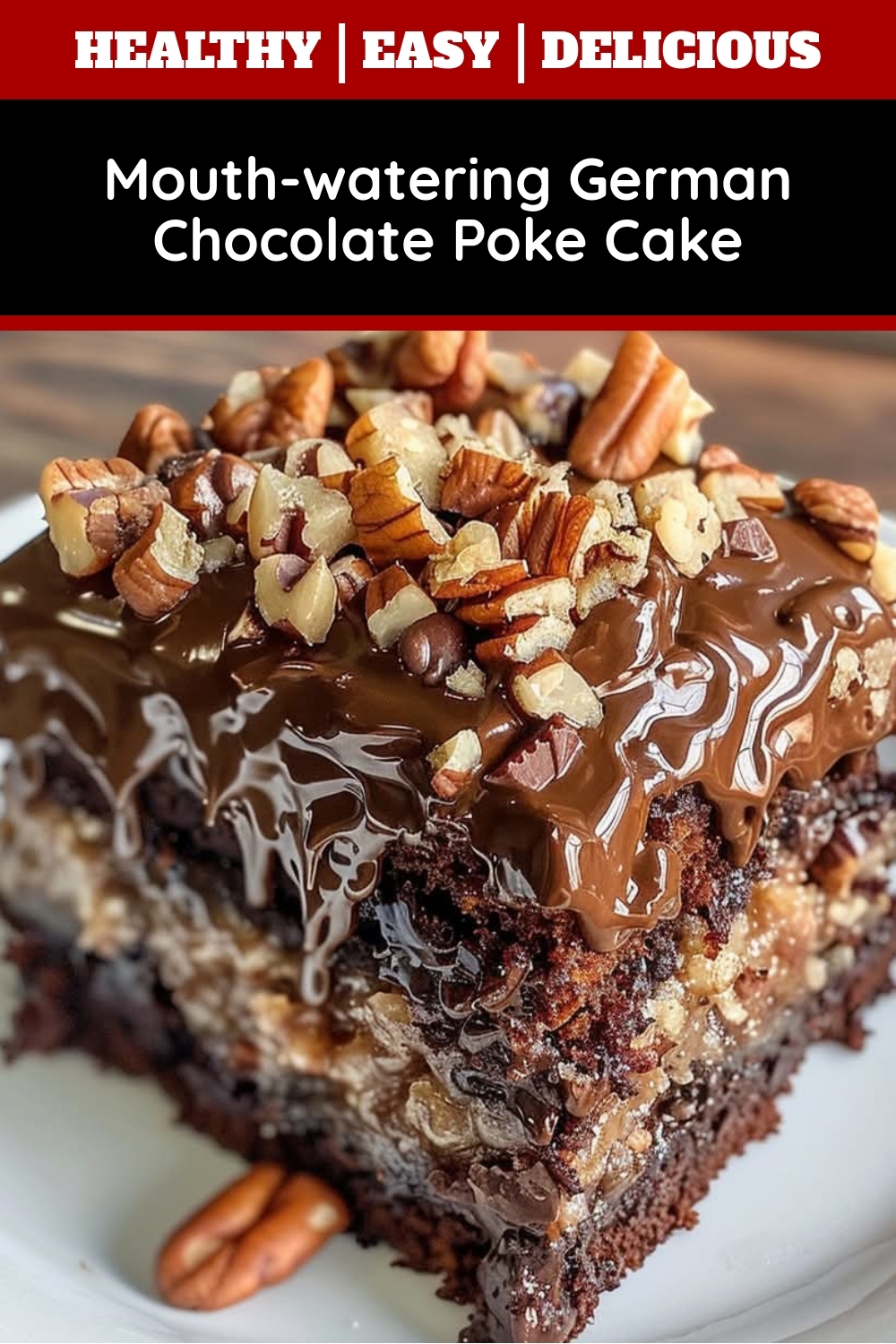 One bite of this Mouth-watering German Chocolate Poke Cake sends your taste buds into overdrive. The rich chocolate cake base soaks up a luscious caramel-coconut glaze, creating an irresistibly moist and tender crumb. Toasted pecans add a satisfying crunch, while the fluffy coconut-pecan frosting delivers a creamy, slightly chewy contrast. Every forkful bursts with deep cocoa notes, sweet caramel undertones, and a hint of vanilla warmth. The aroma alone—a heady mix of melted chocolate and toasted coconut—will have everyone hovering near the kitchen. Truly, this Mouth-watering German Chocolate Poke Cake is a symphony of textures and flavors that keeps you coming back for more.