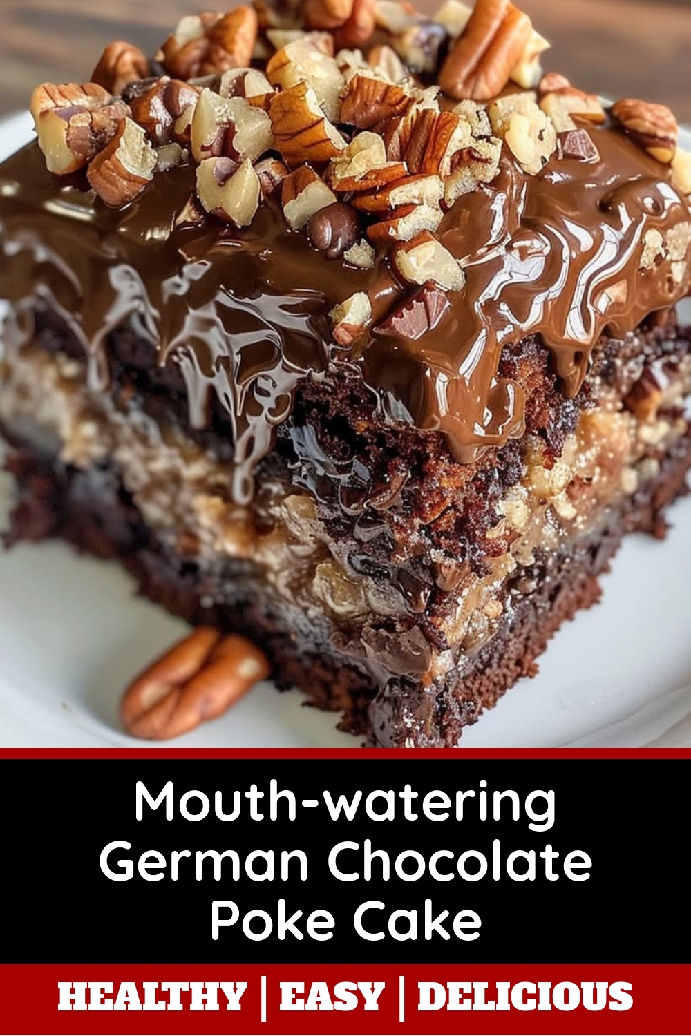 A decadent German chocolate poke cake with layers of rich chocolate, coconut, and pecans.
