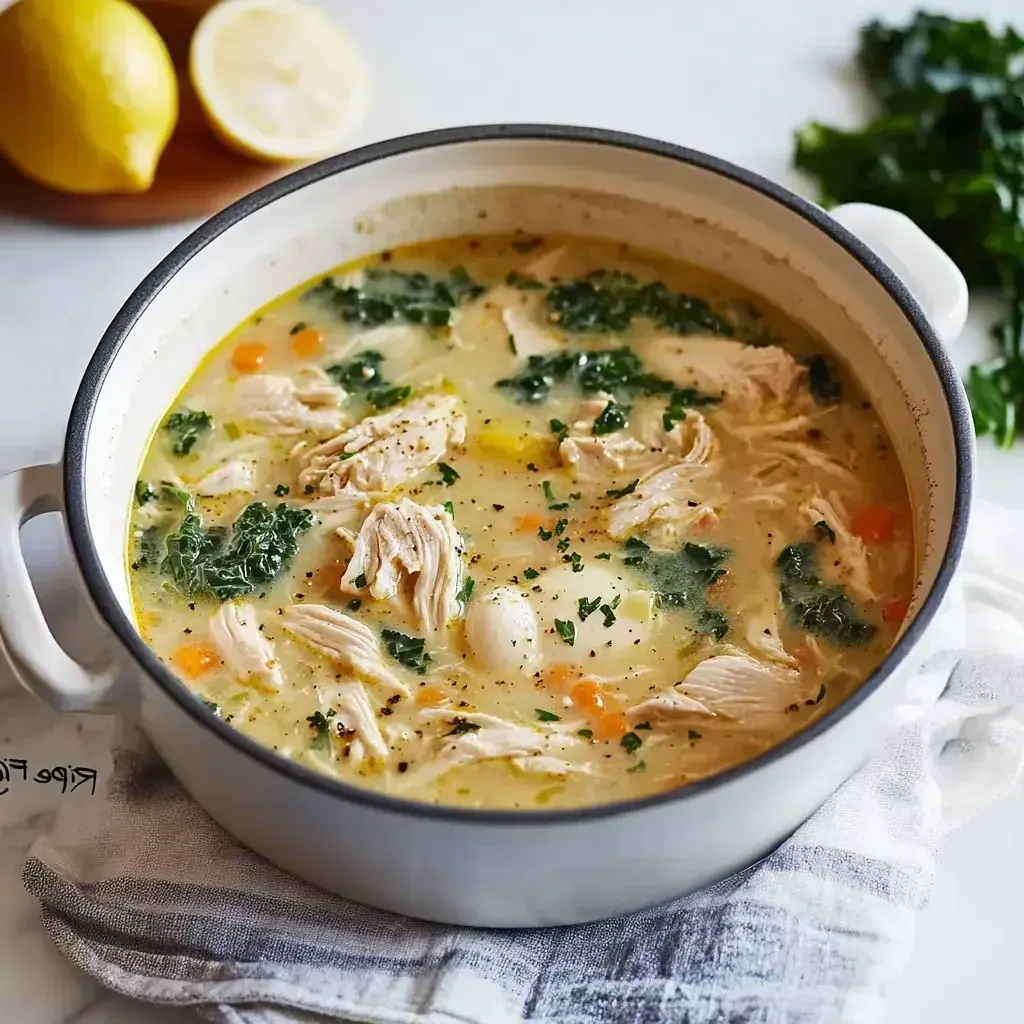 A classic Greek soup featuring tender chicken and rice in a velvety lemon-egg broth, brightened with fresh dill and enriched with kale.