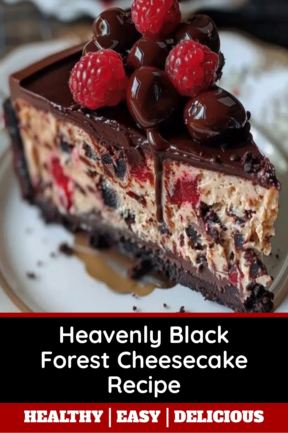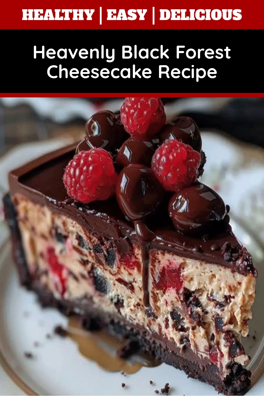 Start by preheating your oven to 325°F and greasing a 9-inch springform pan. Meanwhile, crush chocolate cookies into fine crumbs and mix them with melted butter for the crust. Press this mixture firmly into the pan, then bake for 10 minutes to set it. While the crust cools, beat cream cheese, sugar, and vanilla until smooth. Next, whisk in eggs one at a time, blending well after each addition. To save time, use a stand mixer or food processor for this step. Now, gently fold in chopped cherries and chocolate chunks for that signature Heavenly Black Forest Cheesecake Recipe flavor. Pour the filling over the crust and smooth the top. Bake for 50-55 minutes until the edges are set but the center still jiggles slightly. Let it cool completely before chilling for at least 4 hours—overnight works even better. Finally, top with whipped cream, extra cherries, and a drizzle of chocolate sauce for a stunning finish.