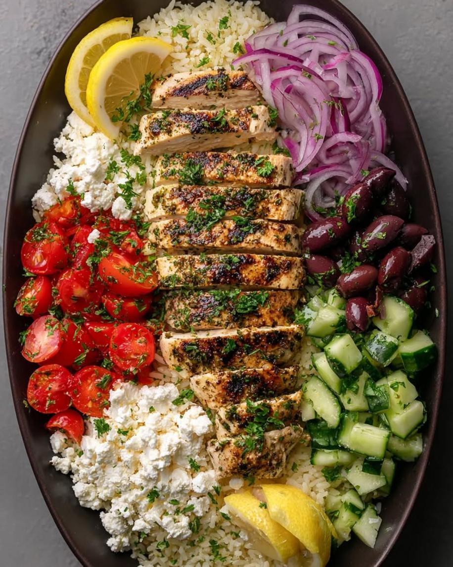 A vibrant and healthy bowl featuring grilled chicken, rice, feta cheese, olives, and fresh Mediterranean flavors.