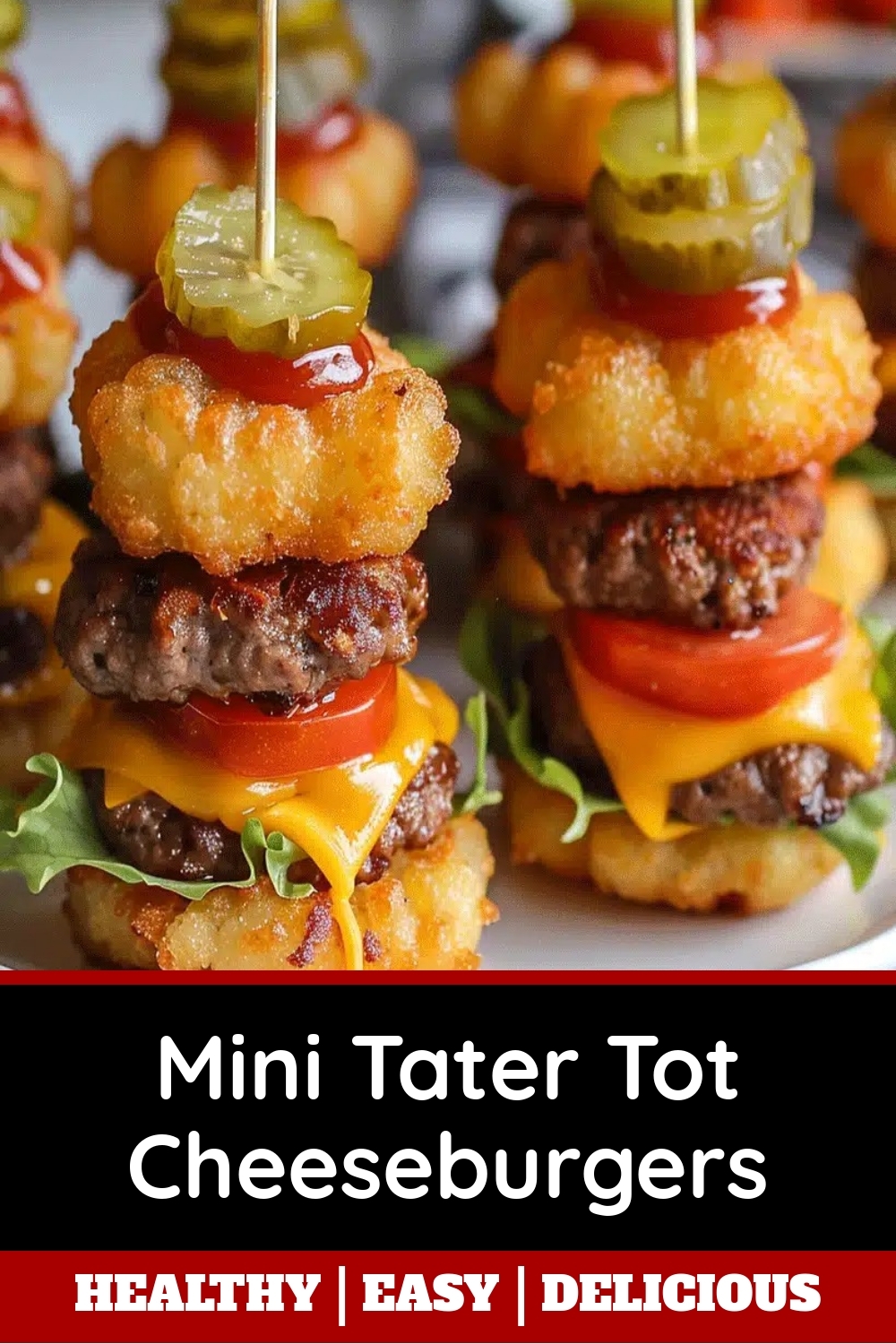 - Assemble the mini burgers by placing a cheesy patty between two tater tots. Add a dollop of sauce and pickles if desired. Secure with toothpicks if needed.