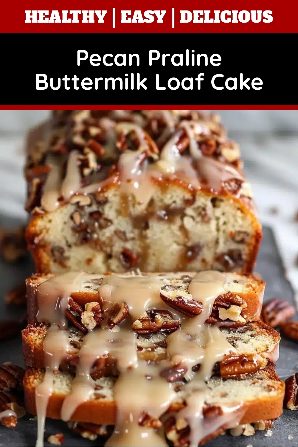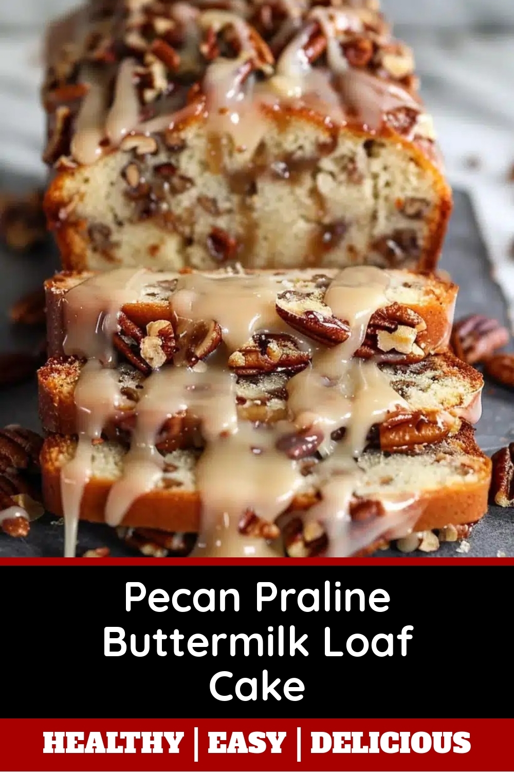 A moist buttermilk loaf cake studded with pecans and topped with a rich praline glaze.
