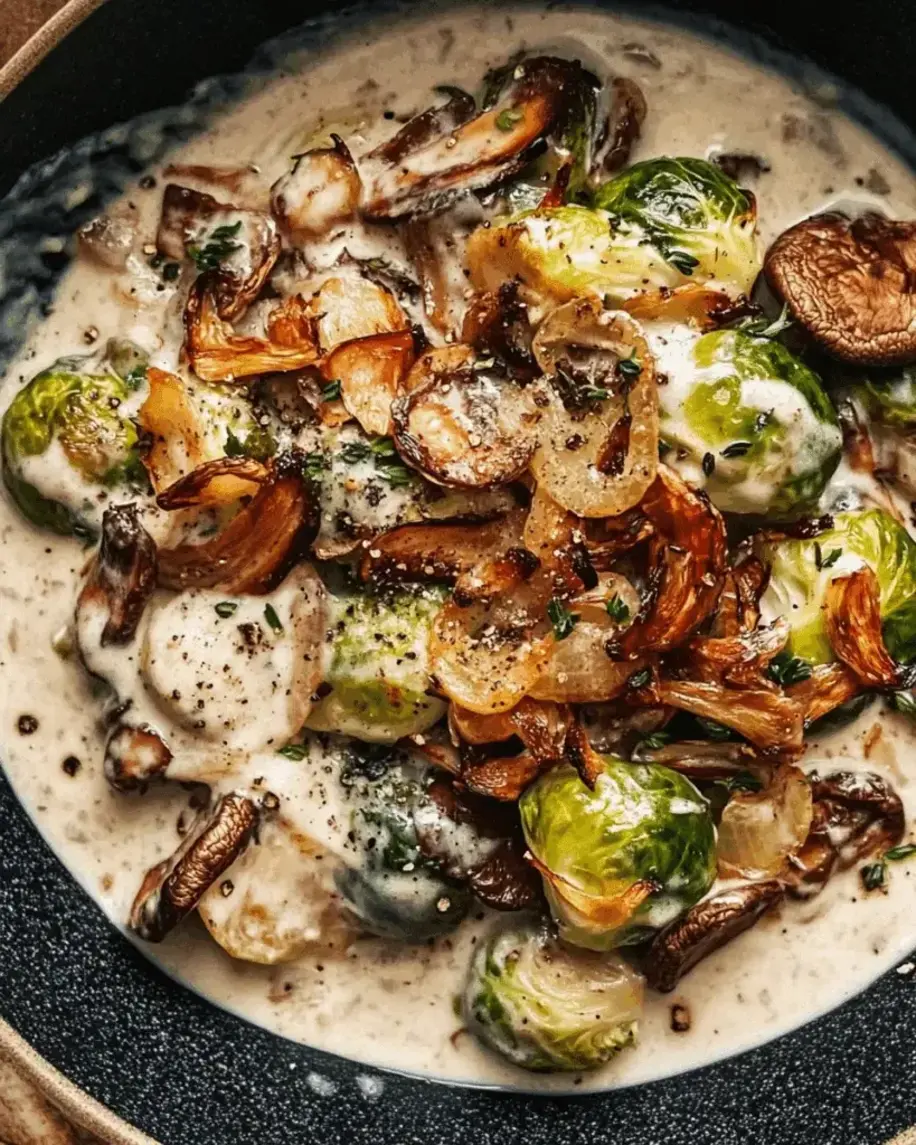 Discover Roasted Brussels Sprouts with Creamy Wild Mushrooms and Crispy Shallots for a flavorful, cozy dish
