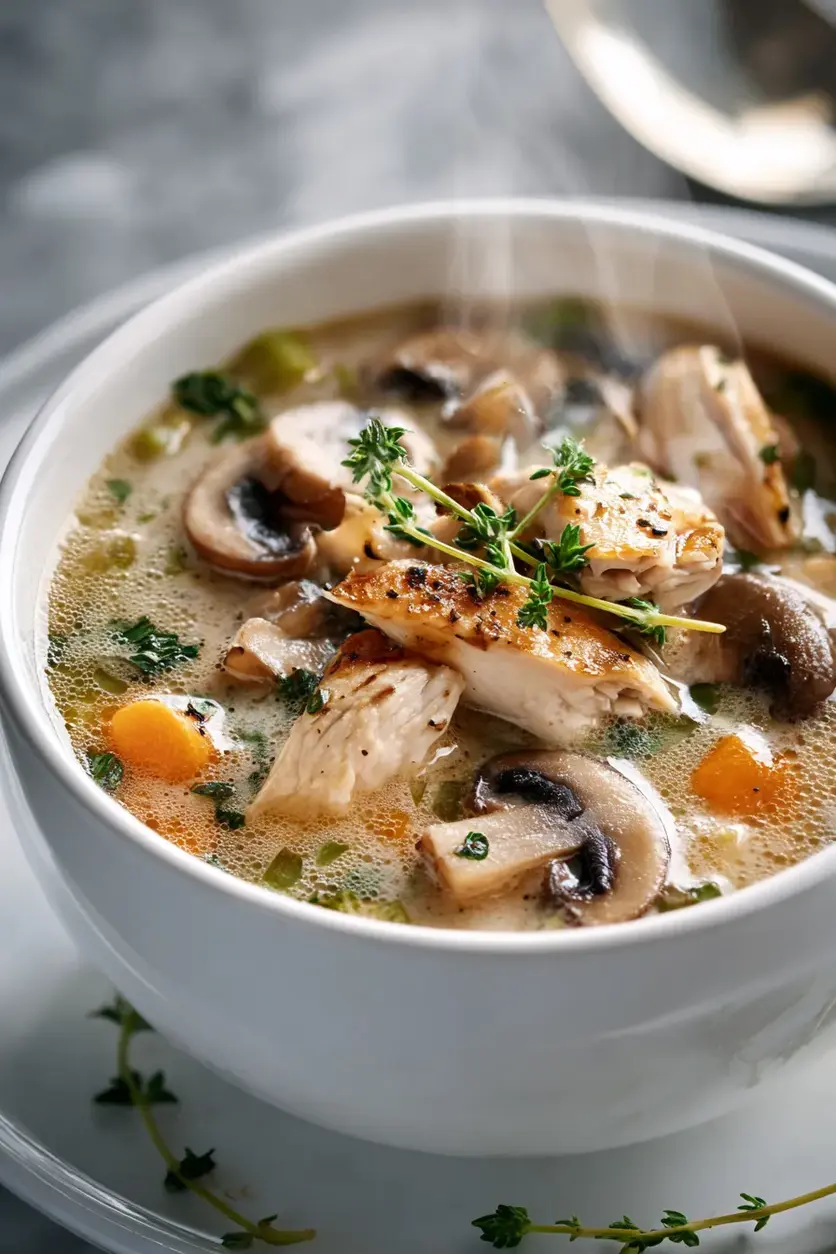A hearty and comforting soup made with tender rotisserie chicken and fresh mushrooms.