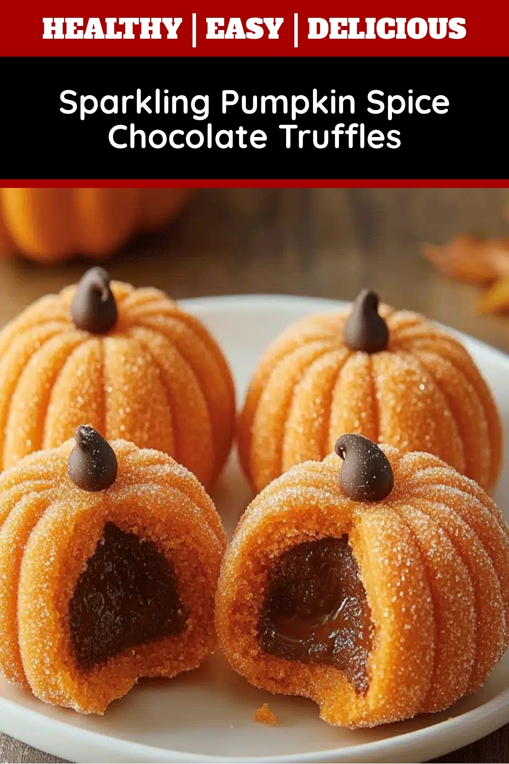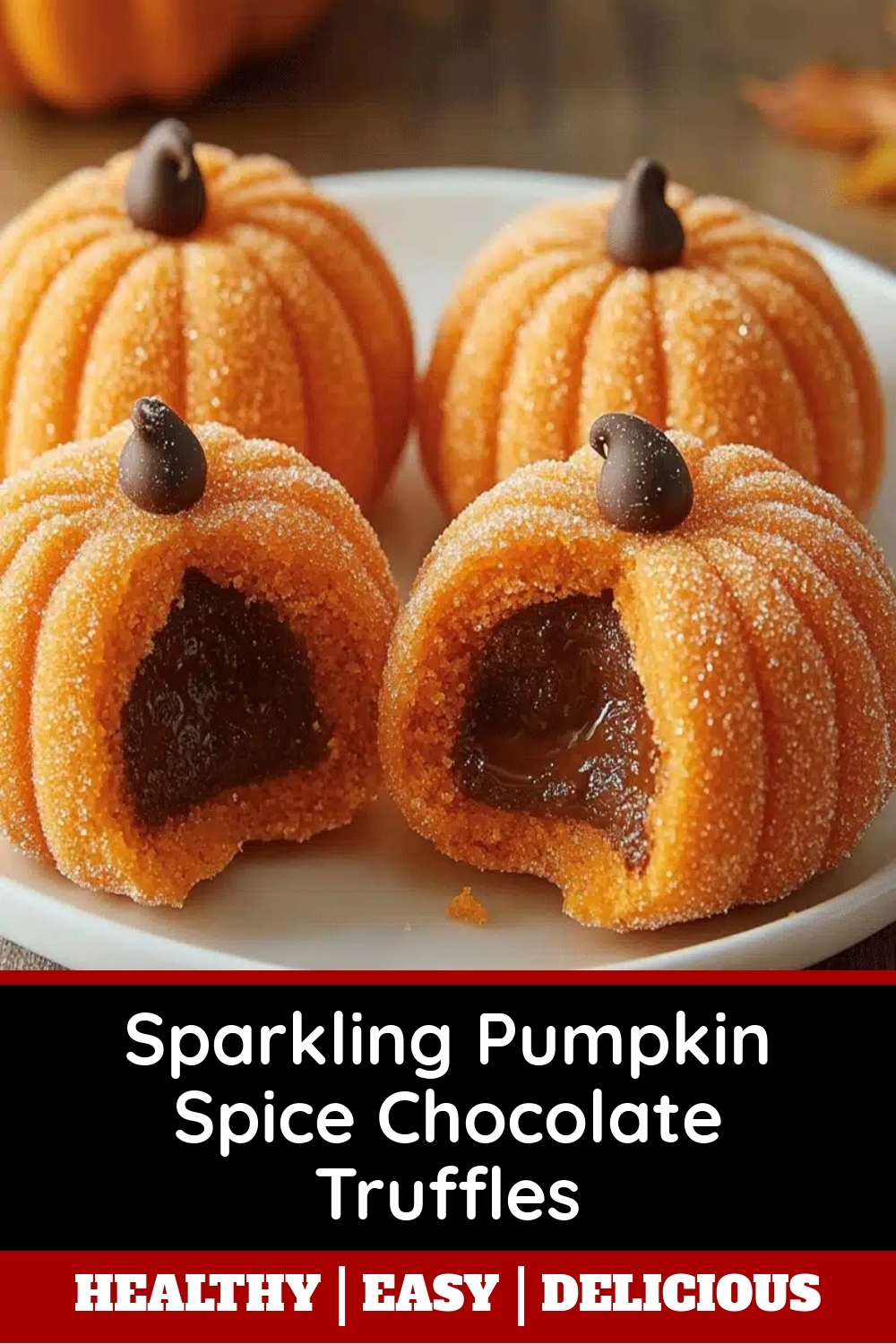 Decadent chocolate truffles infused with pumpkin spice and coated in sparkling sugar for a festive treat.