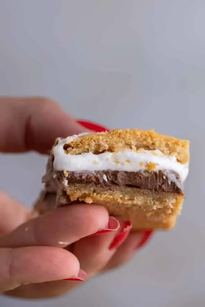These delicious s’mores cookie bars are filled with delicious marshmallow creme and chocolate bars in the center.