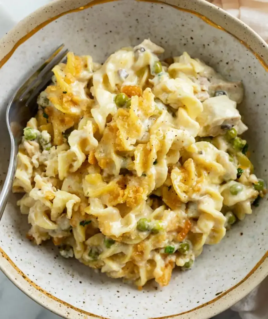 This classic Tuna Noodle Casserole has canned tuna and egg noodles smothered in a creamy mushroom soup filling with cheese and peas. Top it off with buttery Ritz crackers, crispy fried onions, or potato chips.