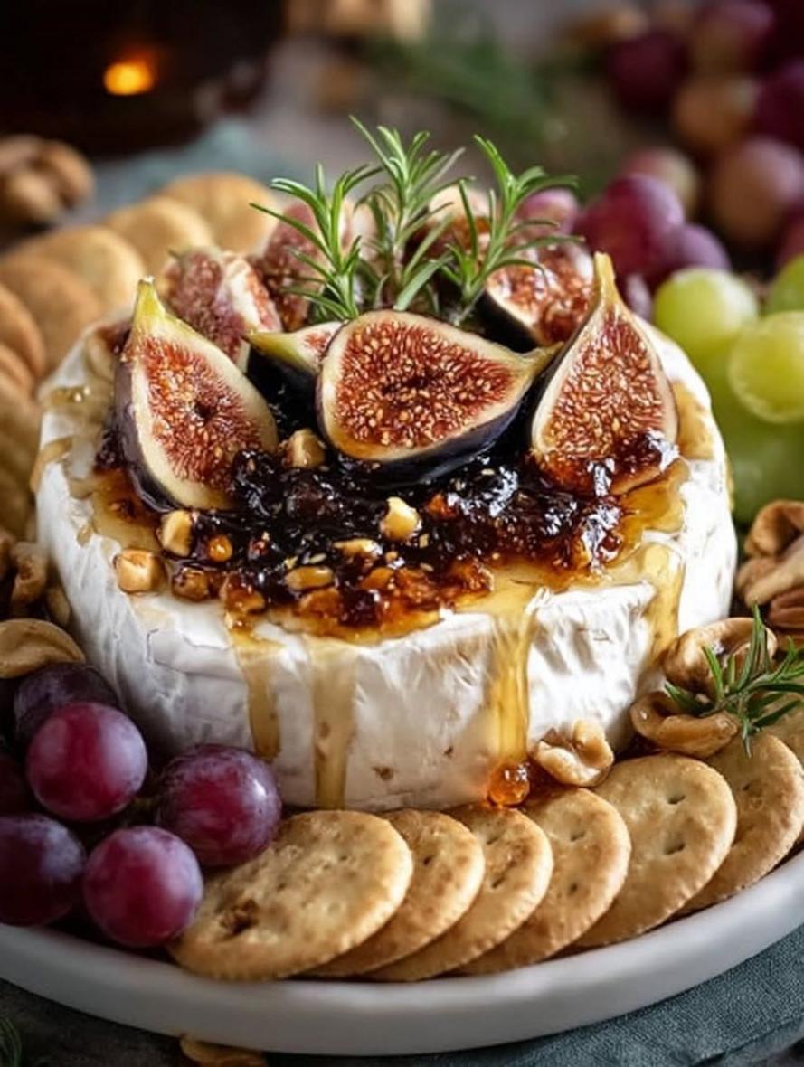 A warm and indulgent baked Brie topped with sweet fig jam and aromatic rosemary, perfect for appetizers.
